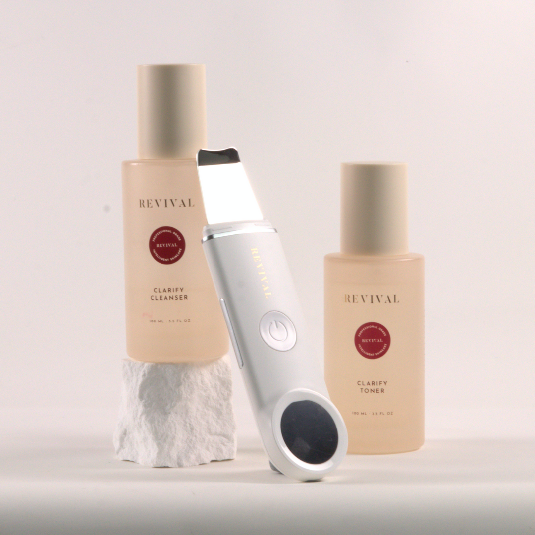 Start with the Prevent Breakout products to deeply cleanse and purify the skin using the Clarify Scrubber and Cleanser, which remove congestion and impurities. Follow with the Treat Blemishes range and microneedling to target breakouts and prevent future blemishes. Buy the facial kit that prioritises your concerns and later progress to the full Clarify facial Kit.